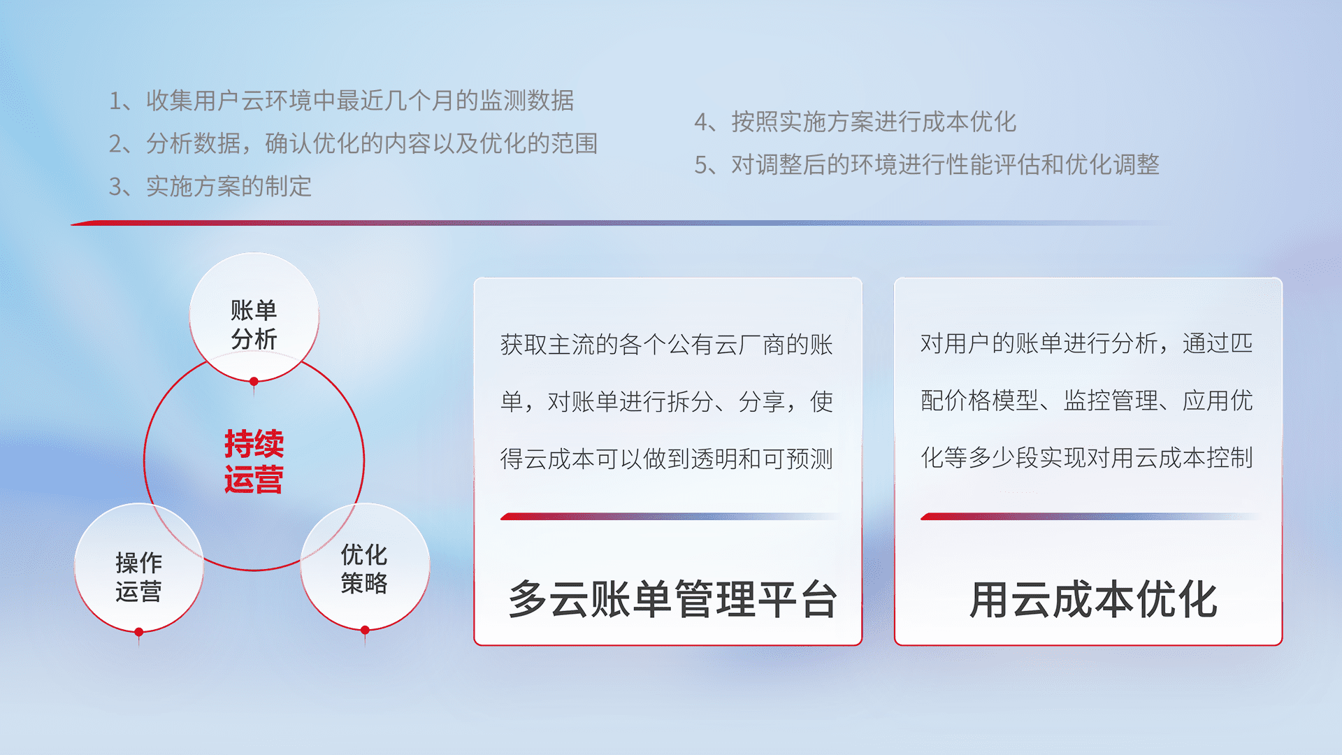 通过多云纳管,,以统一的资源数据模型把客户的云资源进行抽象和封装,,进而实现对多云资源的统一操作,,,,保障云资源管理的可靠性、、稳定性与可用性。。量身定制化运维内容,,配置、、开发运维、、、、补丁管理、、、、备份、、、、监控、、认证和访问管理、、、、审计和日常巡检等,,,保障在用云过程中的可靠度,,稳定度以及高可用率。。。。